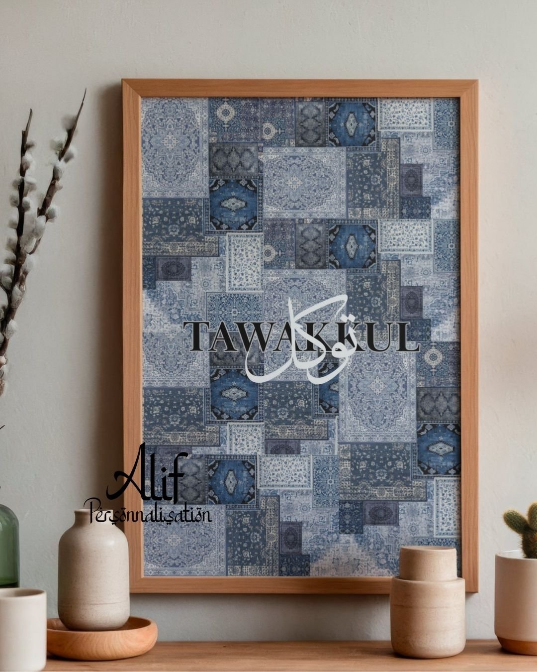 Idéale pour un salon, une chambre ou un coin prière, cette affiche islamique s’intègre parfaitement dans une décoration douce, moderne ou orientale. Le bleu, symbole de sérénité et de profondeur, renforce le message spirituel du mot Tawakkul.