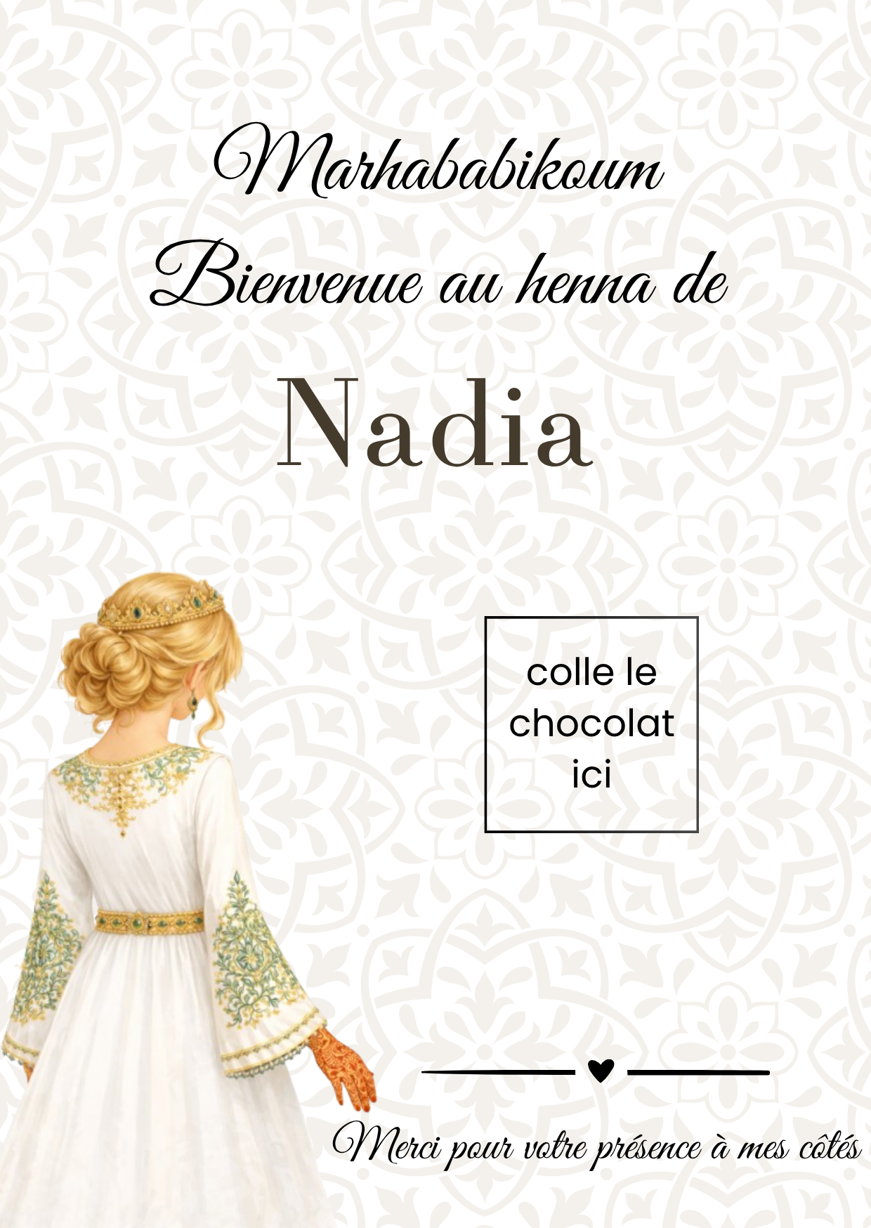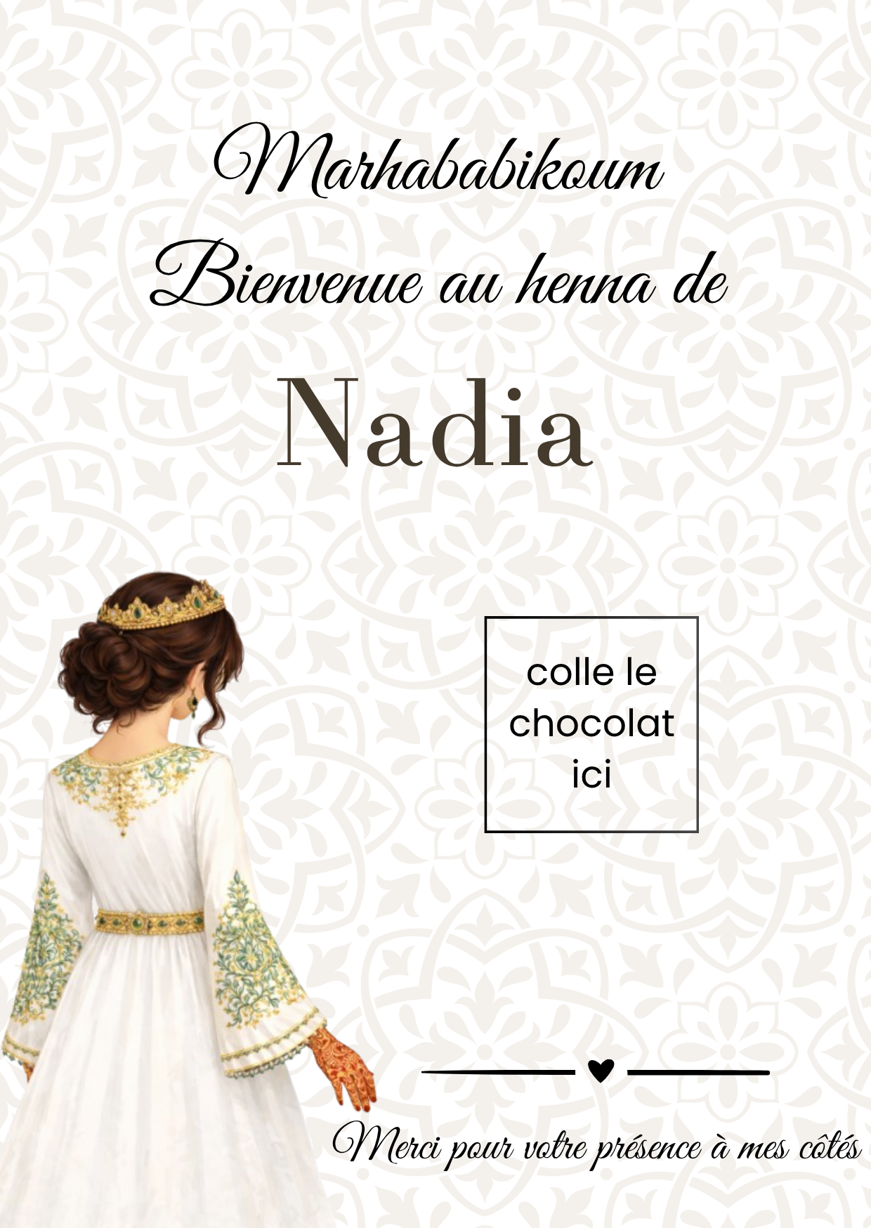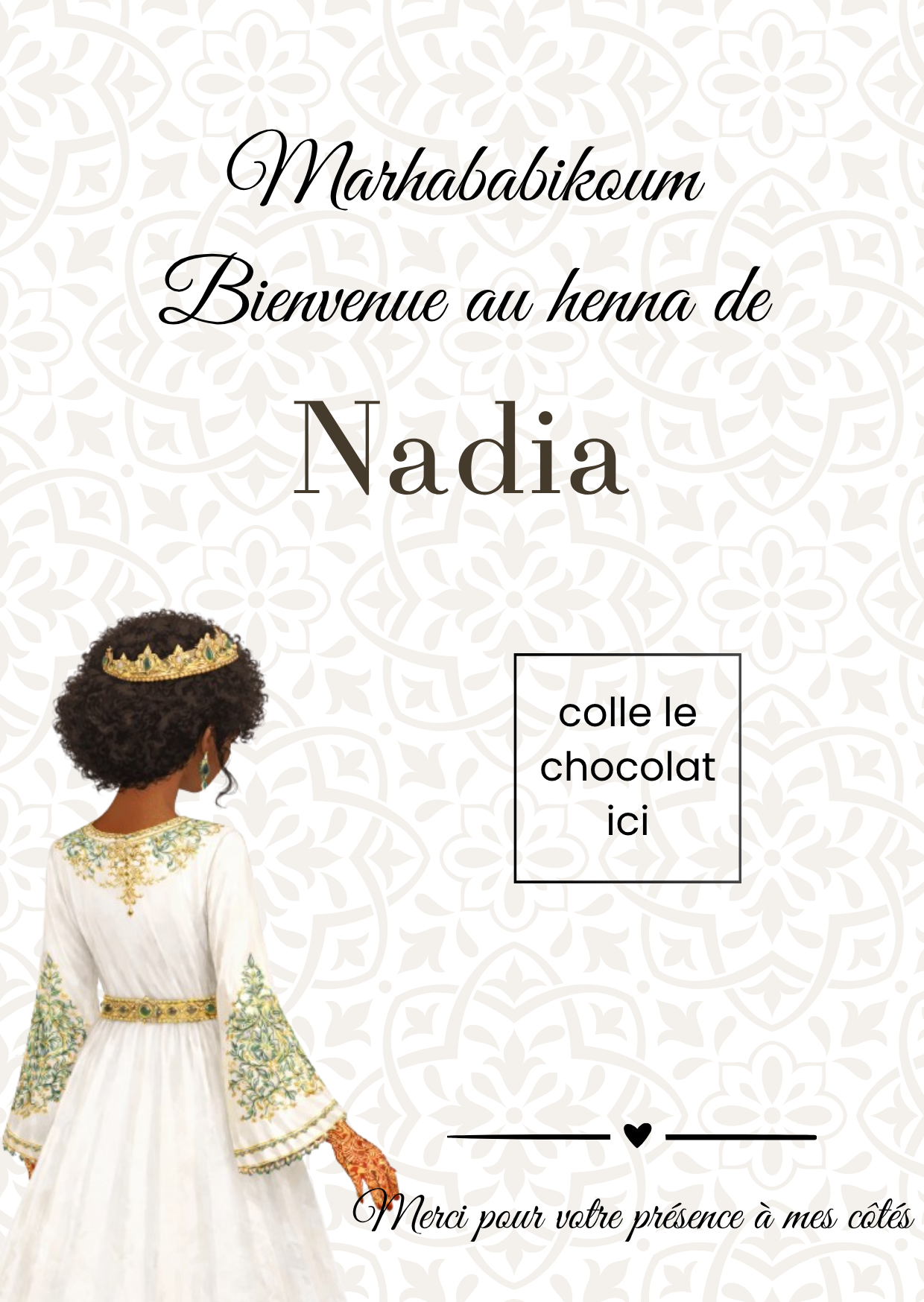 Son motif arabesque , inspiré de l’art oriental, apporte une touche de fraîcheur, d’harmonie et de tradition. Cette carte au format A5 (10 × 15 cm) est idéale pour y coller un chocolat, une gourmandise ou un petit cadeau, afin de remercier vos invitées de leur présence lors de cette soirée symbolique.
