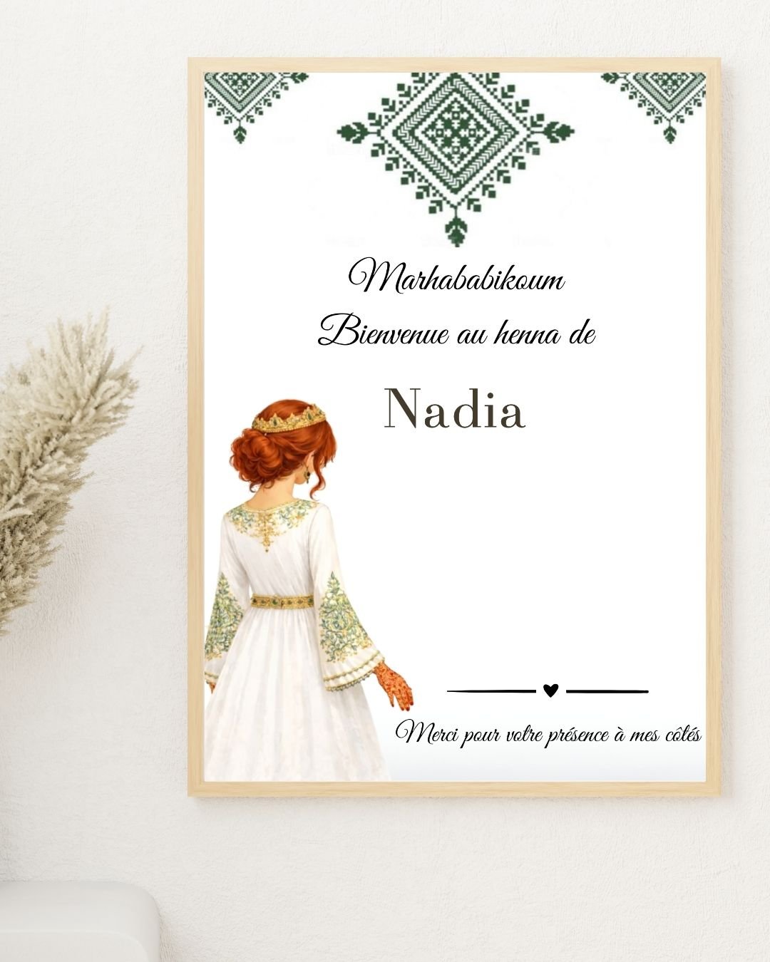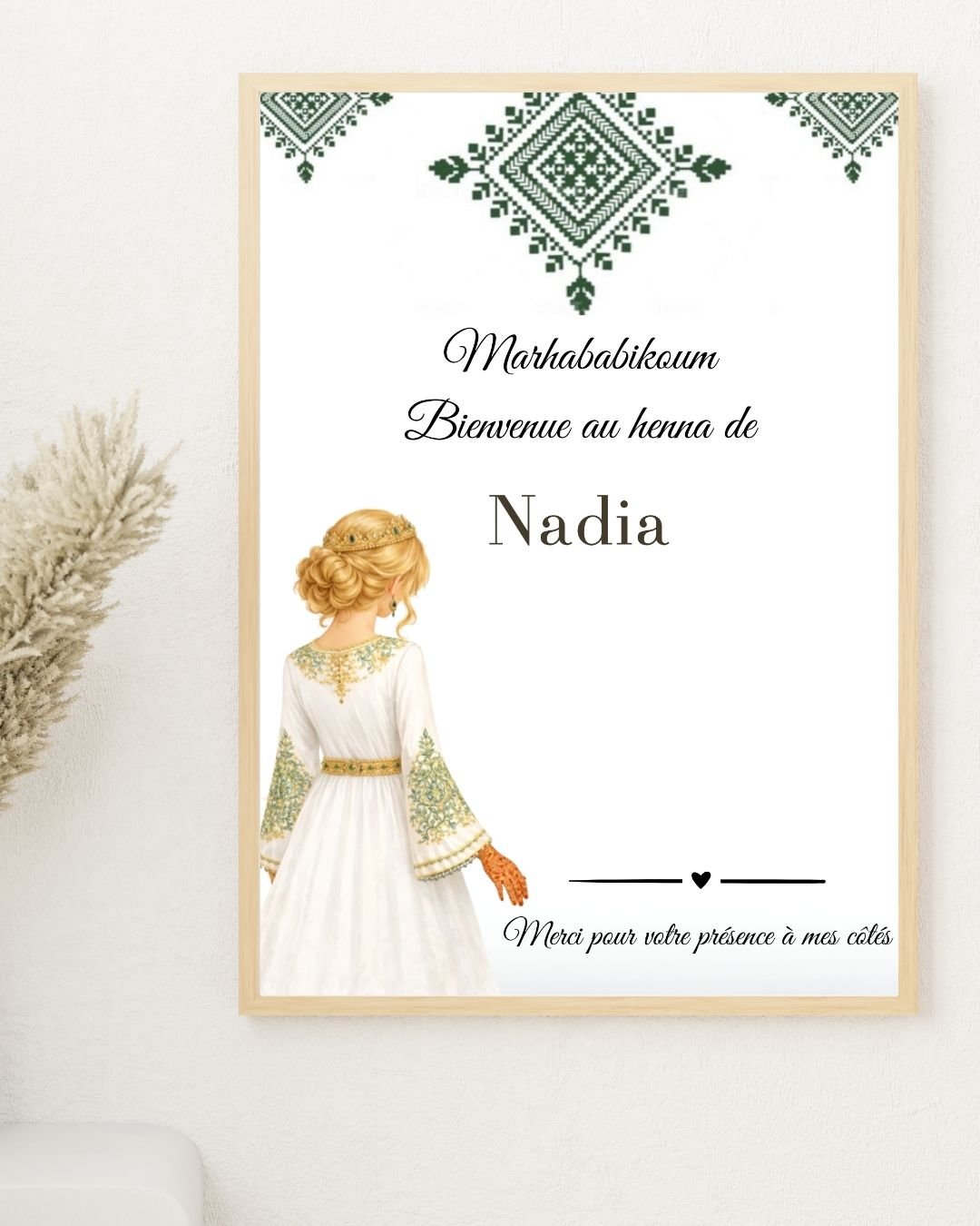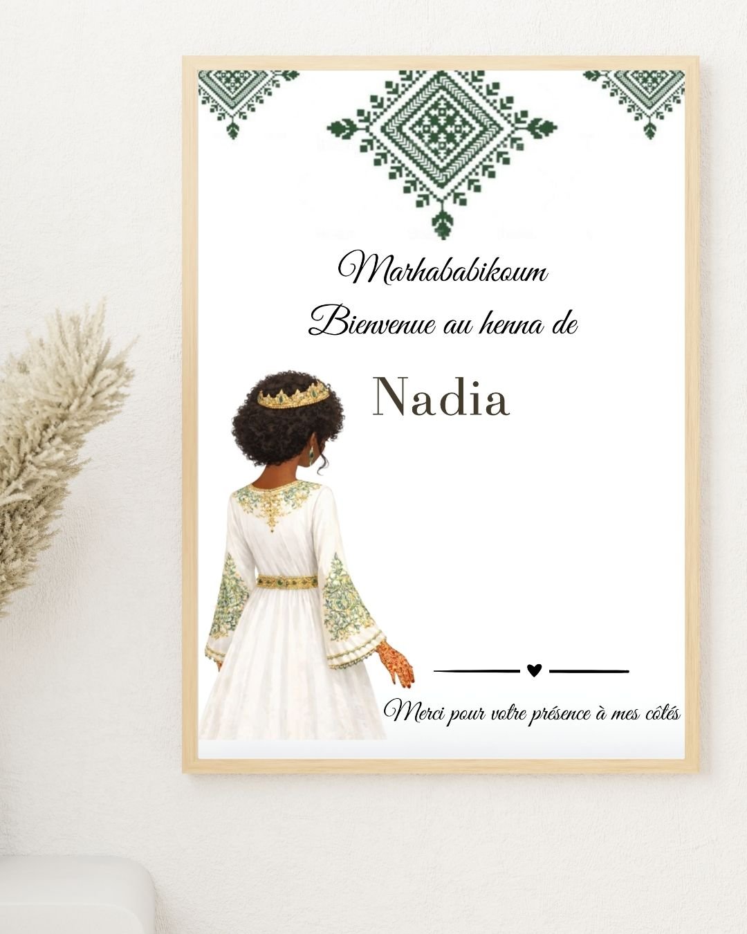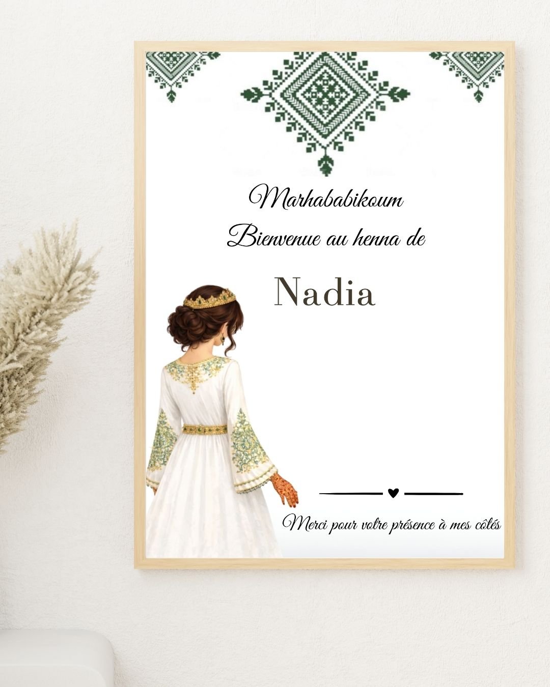 Le design arabesque vert s’intègre parfaitement à une décoration de soirée henné traditionnelle, tout en restant doux et moderne.