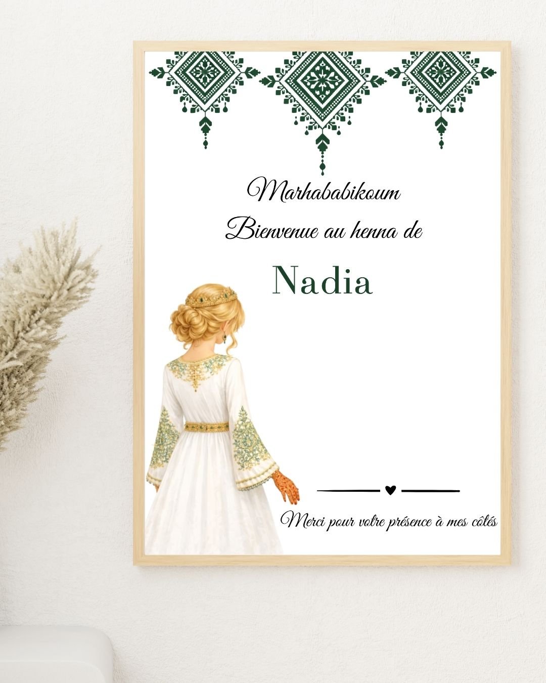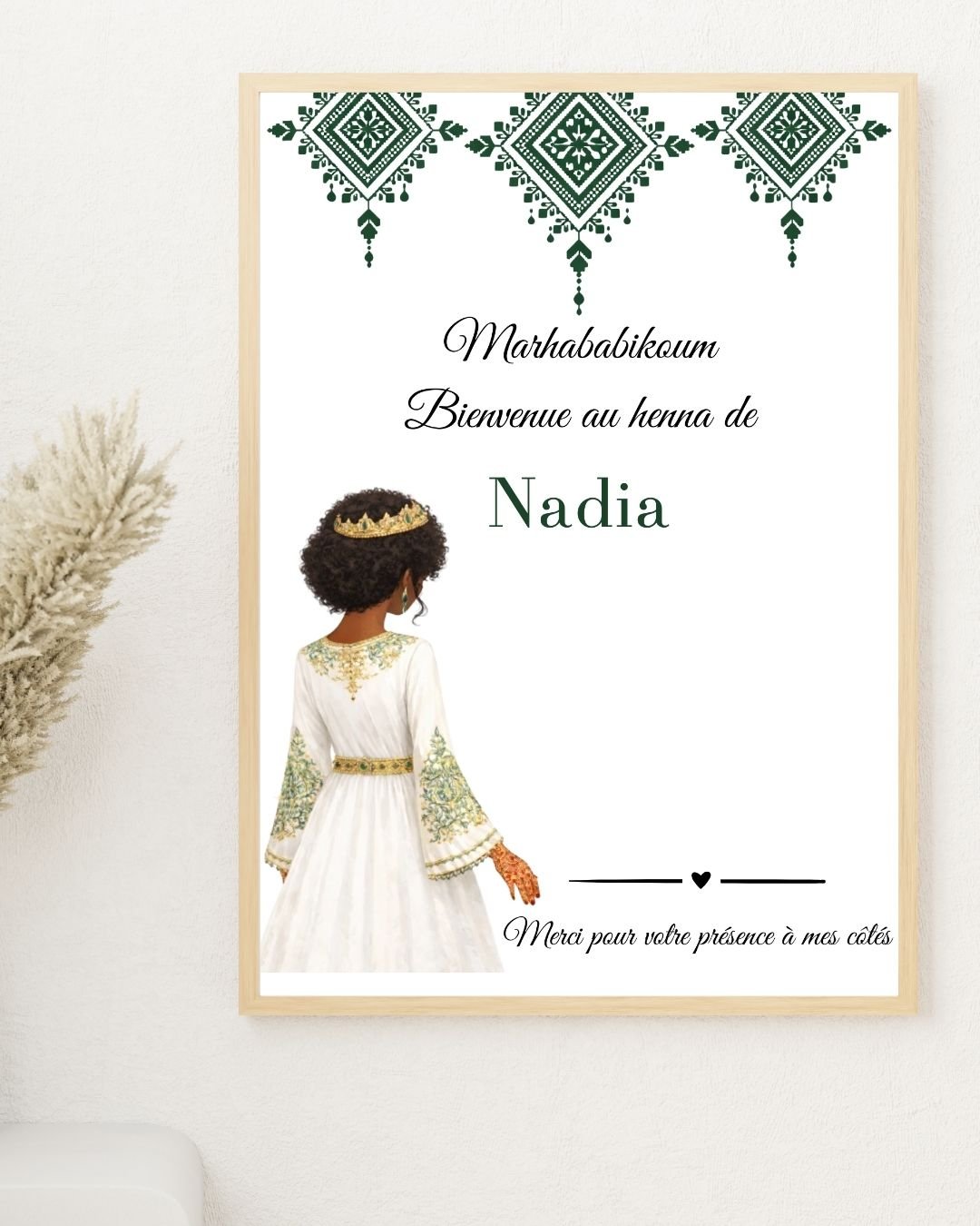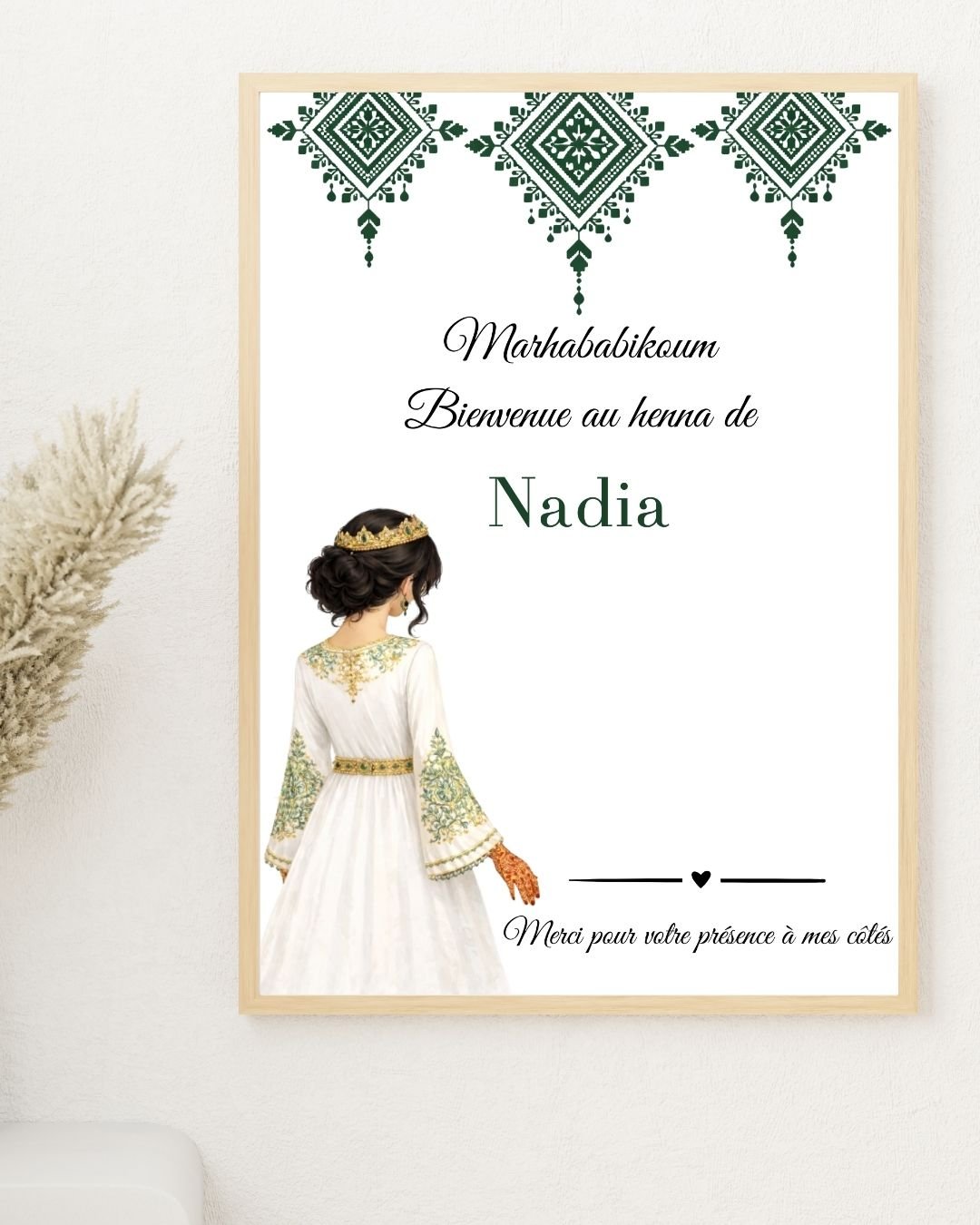 Le design arabesque vert s’intègre parfaitement à une décoration de soirée henné traditionnelle, tout en restant doux et moderne.