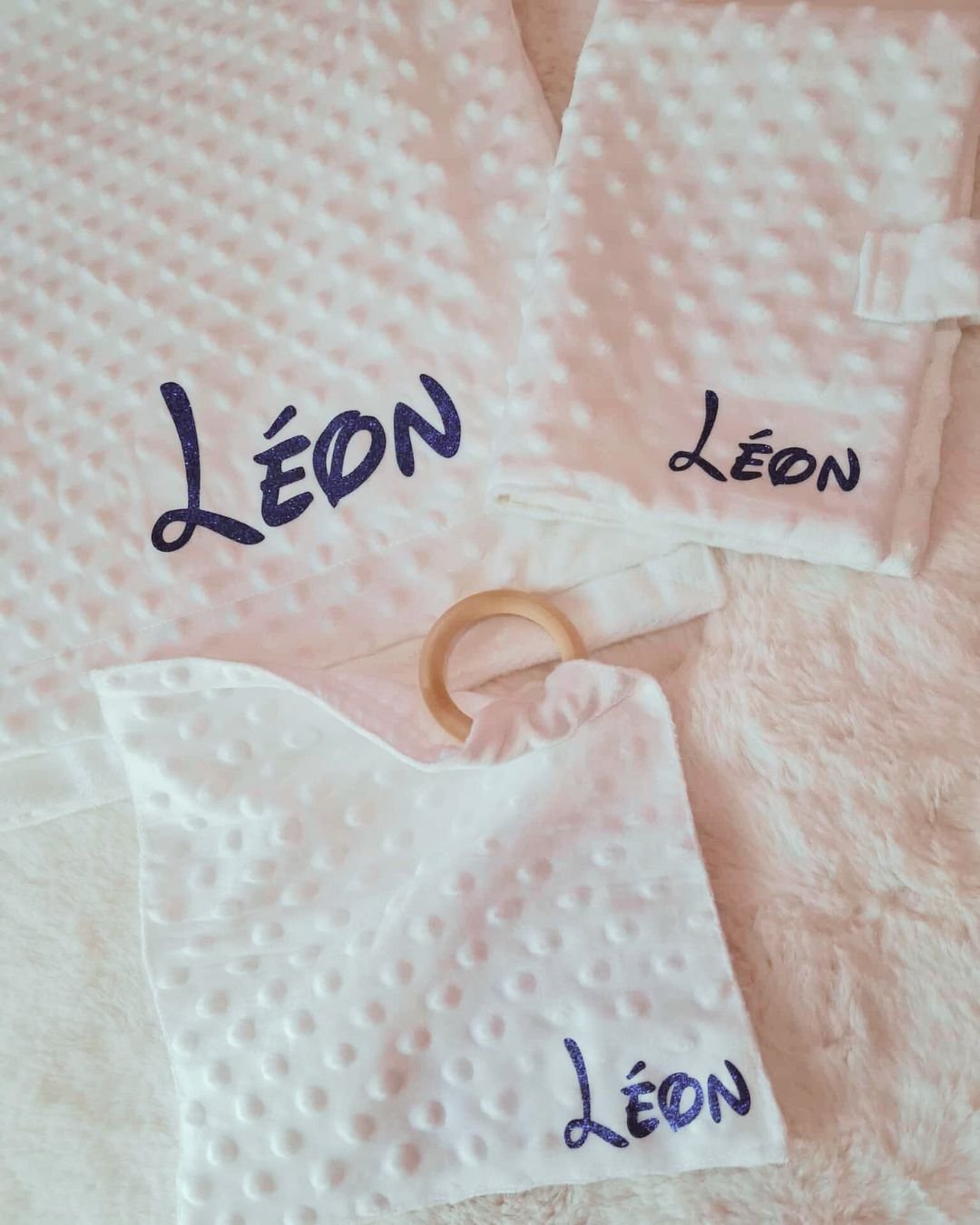 Offrez un cadeau unique et plein de tendresse avec cet ensemble bébé personnalisé en tissu minky, composé d’une couverture, d’un doudou et d’un protège carnet de santé assortis.