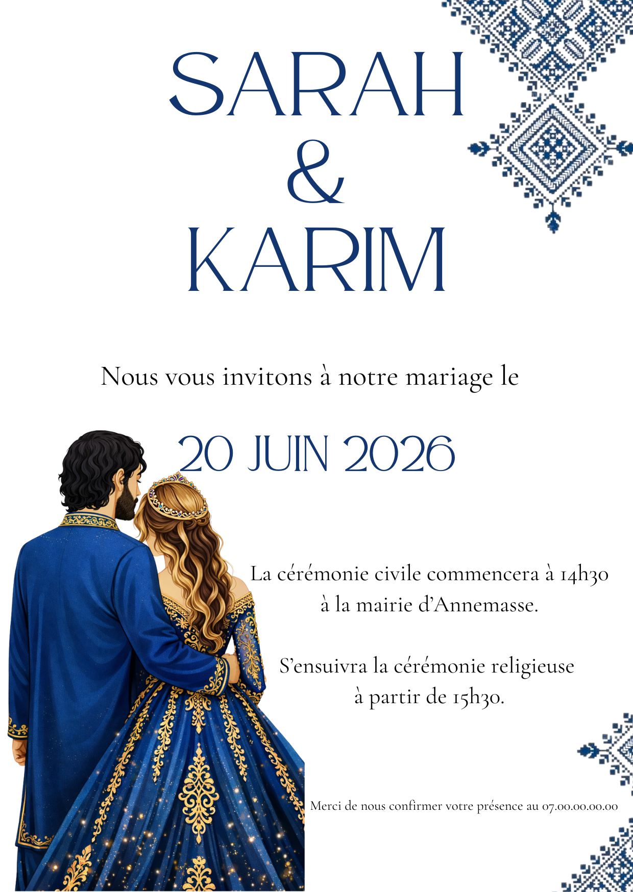 Ce faire-part mariage oriental bleu et or incarne à la fois élégance, douceur et prestige.