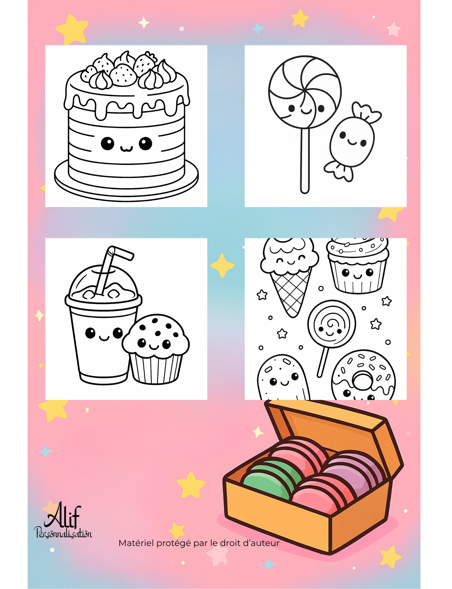 Ce cahier de coloriage PDF de 60 pages rassemble des illustrations adorables autour du thème des gourmandises : bonbons, glaces, cupcakes, pop-corn, macarons, barbes à papa, milkshakes, canettes de soda et bien plus encore. Chaque dessin est pensé pour être simple, mignon et accessible, aussi bien pour les enfants que pour les adultes fans de style kawaii.