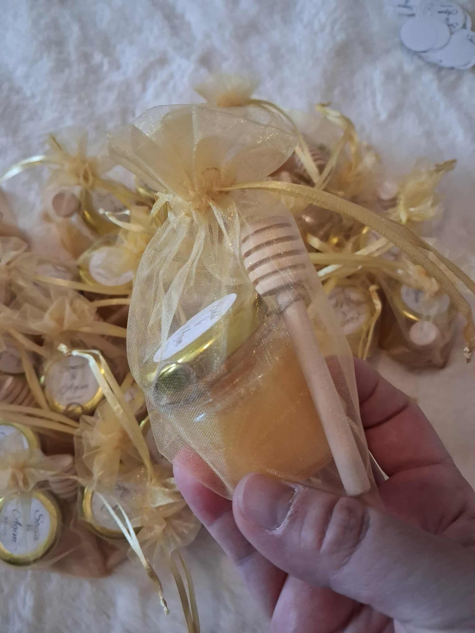 3.50€ par pot de miel (autocollant, sachet organza et cuillère en bois inclus)