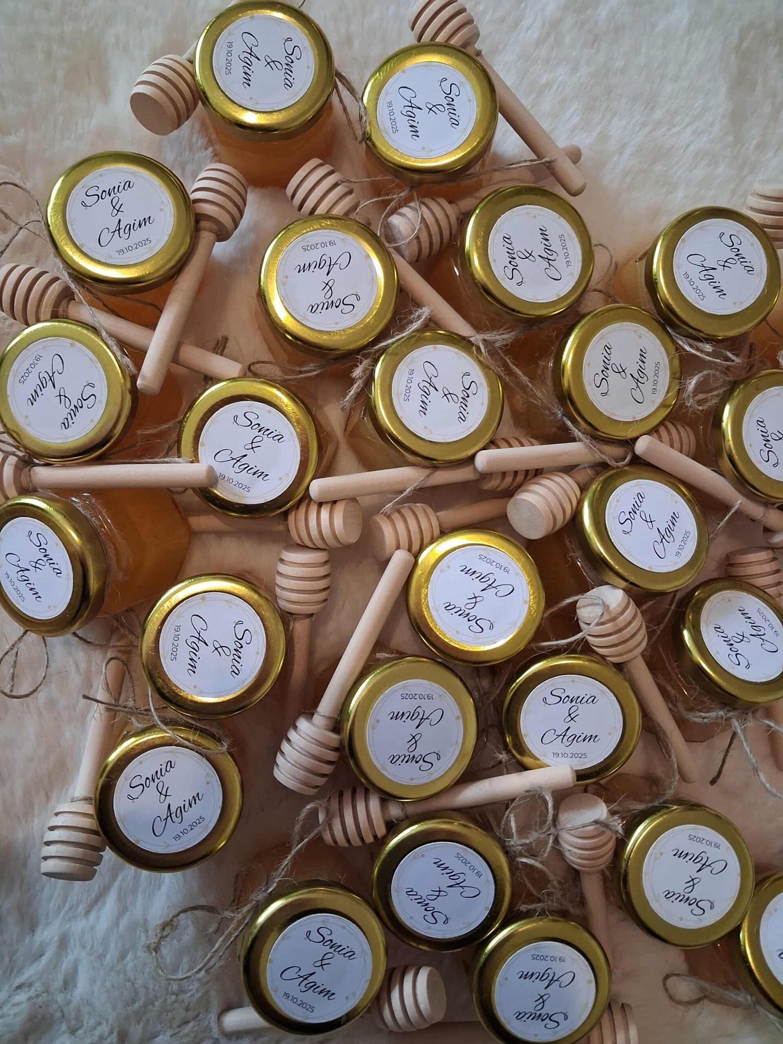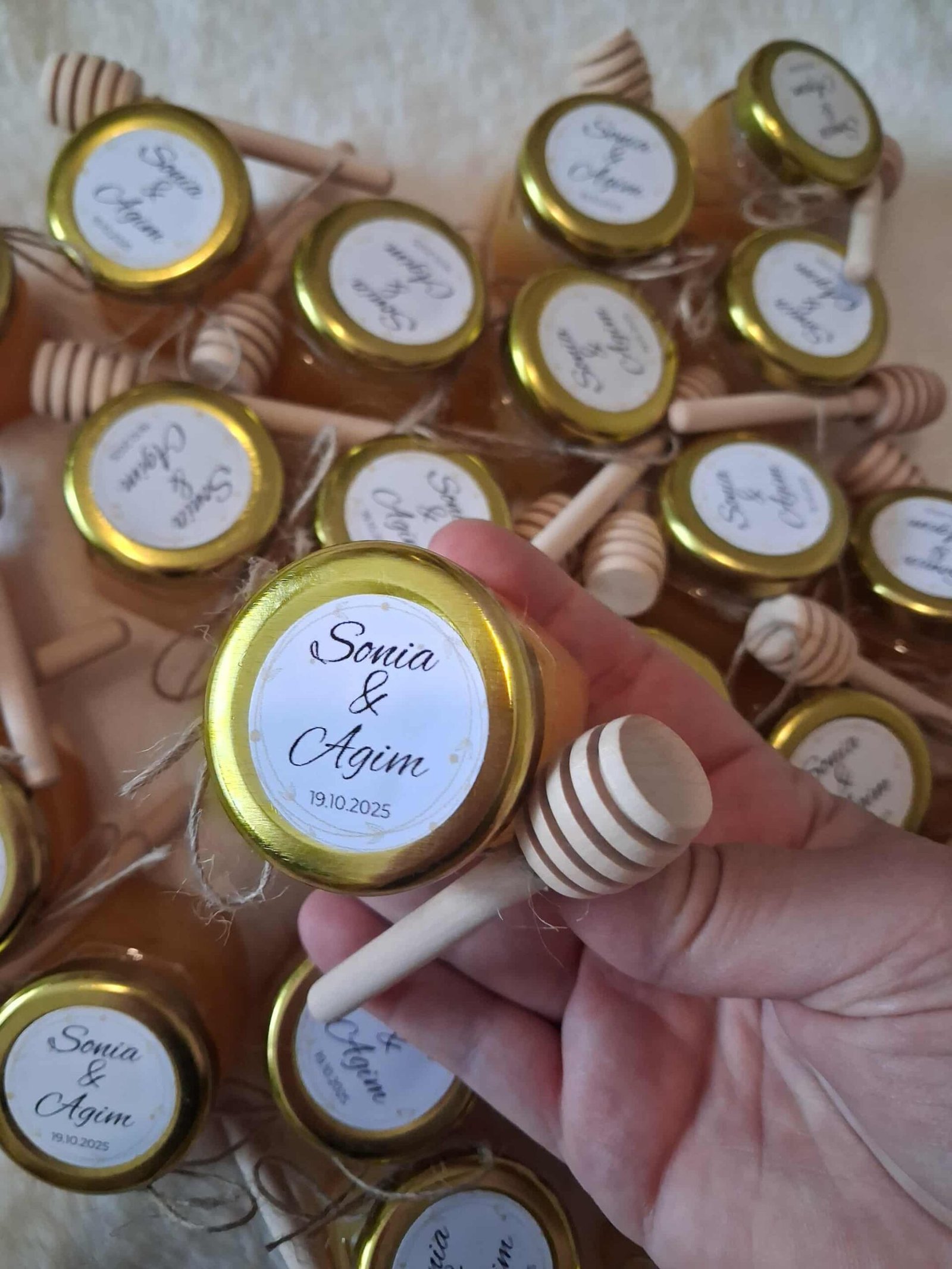 Offrez à vos invités un souvenir authentique et plein de douceur avec ce pot de miel de mariage personnalisé, orné d’un autocollant personnalisé avec les prénoms des mariés et la date du mariage.