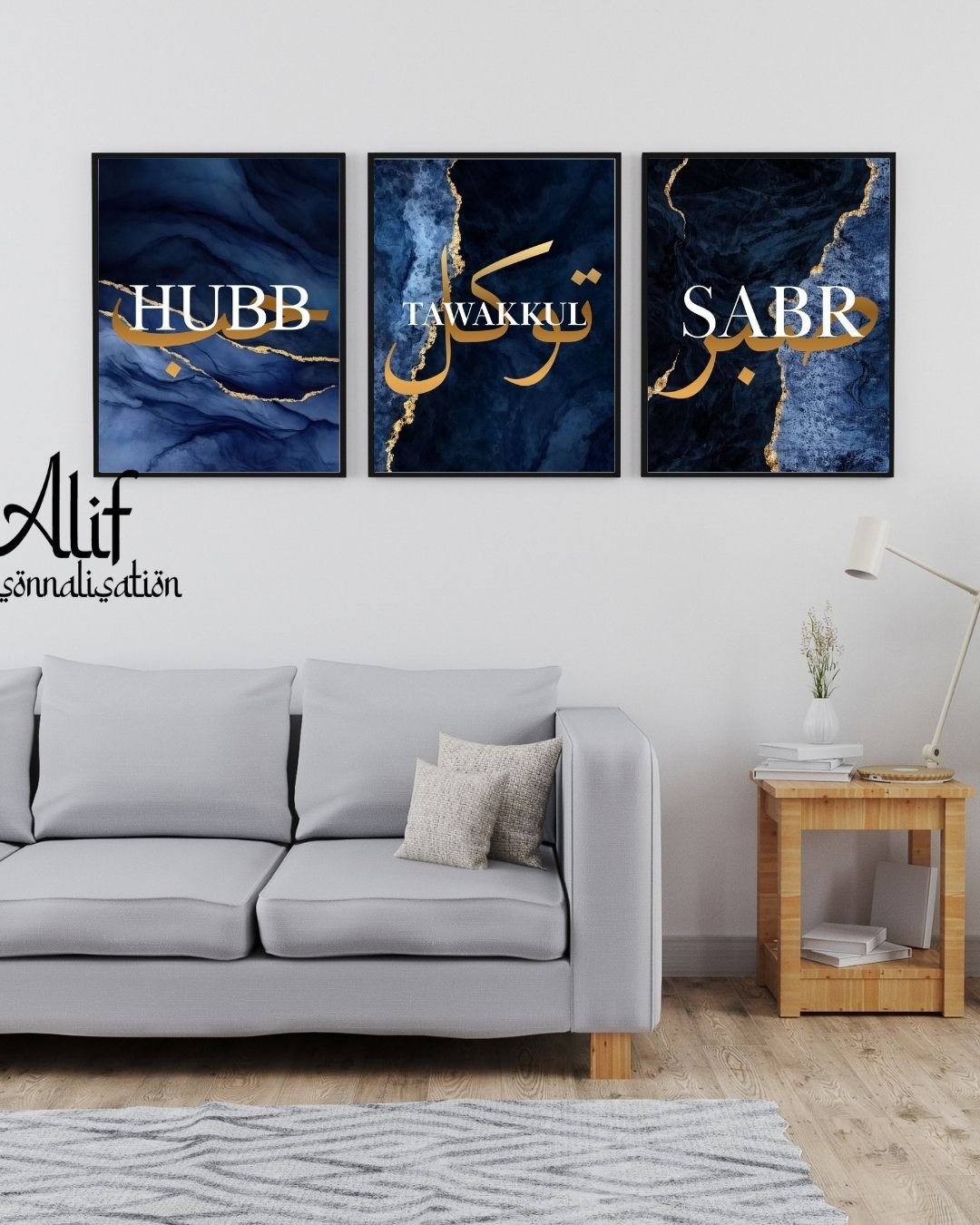 Apportez une touche de spiritualité et d’élégance à votre intérieur avec ce trio d’affiches islamiques marbré bleu et noir, mettant en valeur trois mots essentiels de la foi musulmane : Hubb, Sabr et Tawakkul.