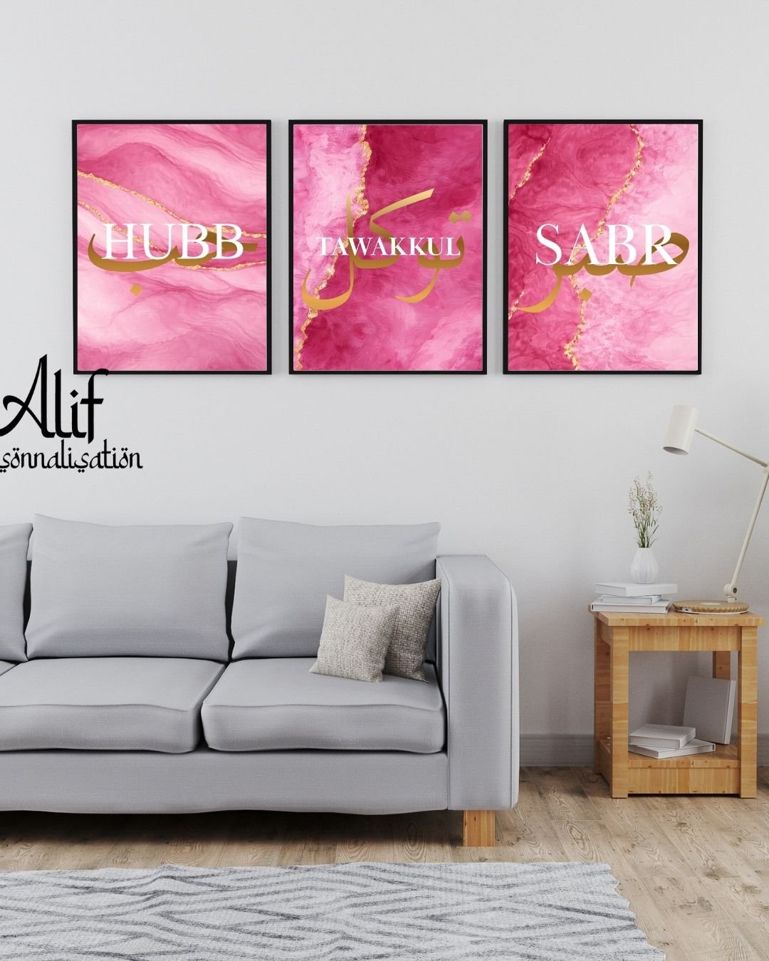 Apportez douceur et spiritualité à votre intérieur avec ce trio d’affiches islamiques marbré rose, mettant à l’honneur trois valeurs essentielles de la foi musulmane : Sabr, Hubb et Tawakkul.